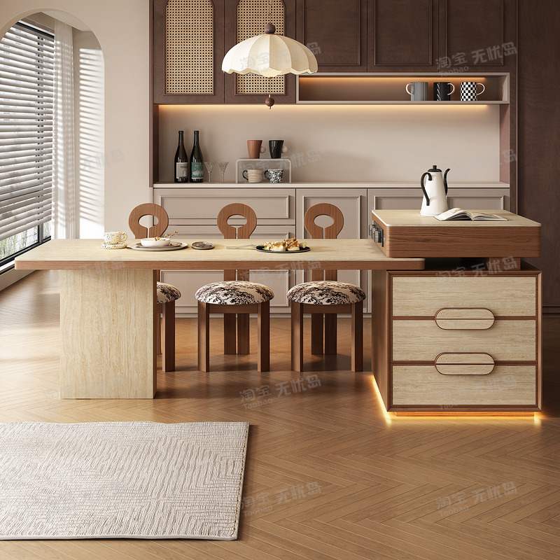 中古风岛台餐桌一体式家用可伸缩厨房餐厅倒台新中式洞石岩板导台