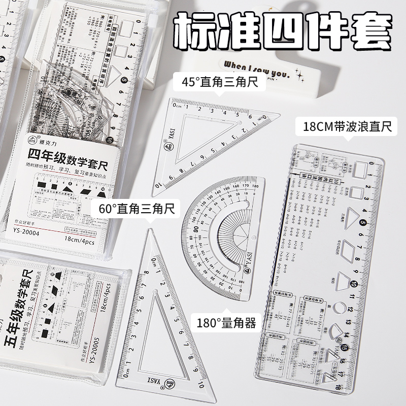 一年级小学生专用尺子四件套尺多功能几何绘图尺带知识点的三角板直尺量角器三角尺套装加减法口诀表儿童格尺