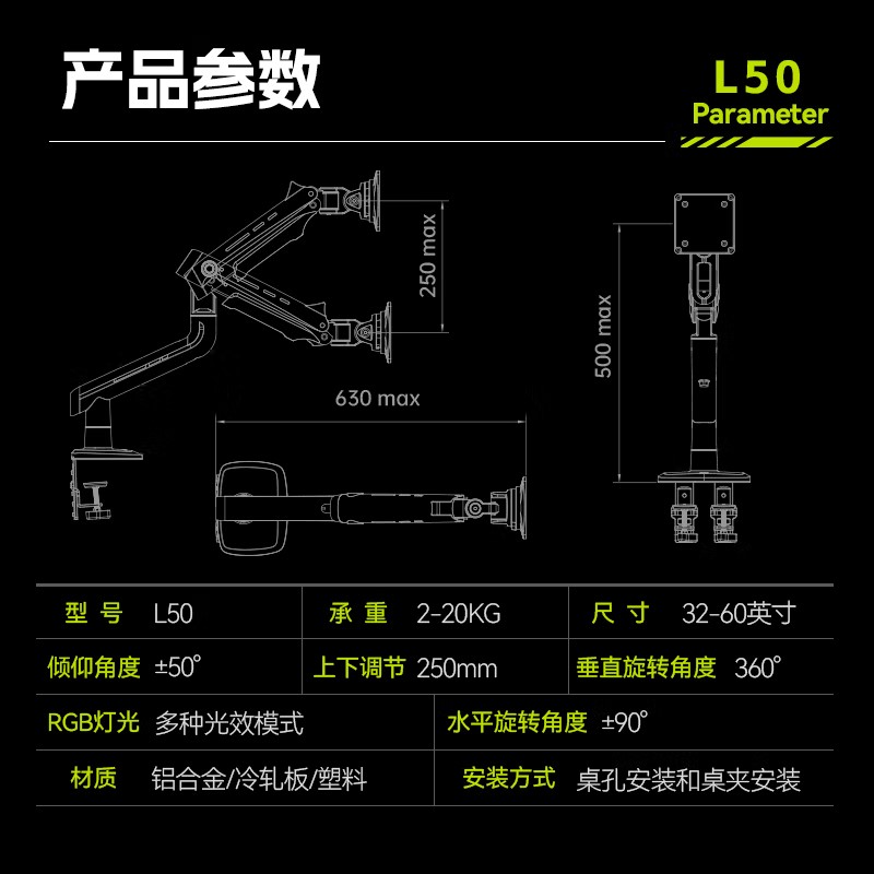 NB L50显示器支架电竞屏幕升降支架RGB桌面增高电竞大承重机械臂