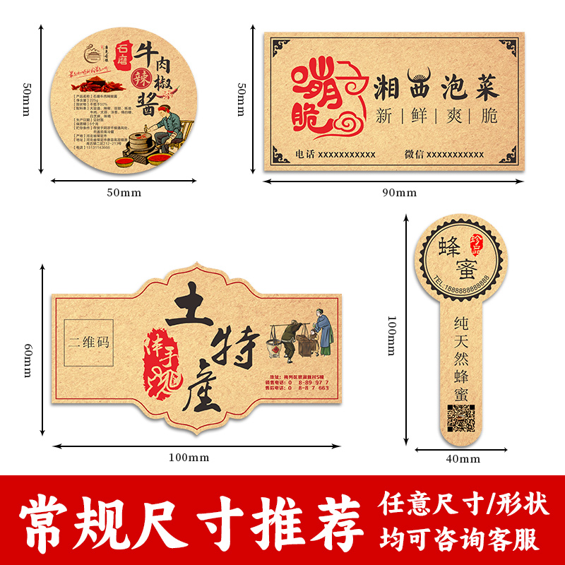 牛皮纸标签贴纸定制玻璃瓶罐装土特产纯手工地瓜干甑糕辣椒酱商标logo订制土蜂蜜泡菜腊肉腊肠熏鸭货不干胶印