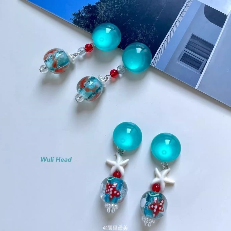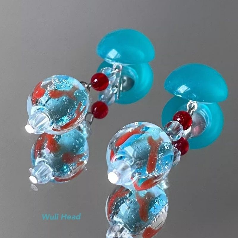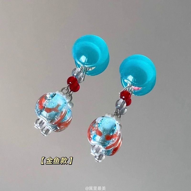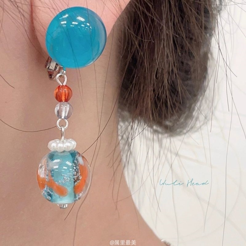 无厘头金鱼海洋梦蓝色琉璃原创手作高级清透感耳环耳夹螺旋