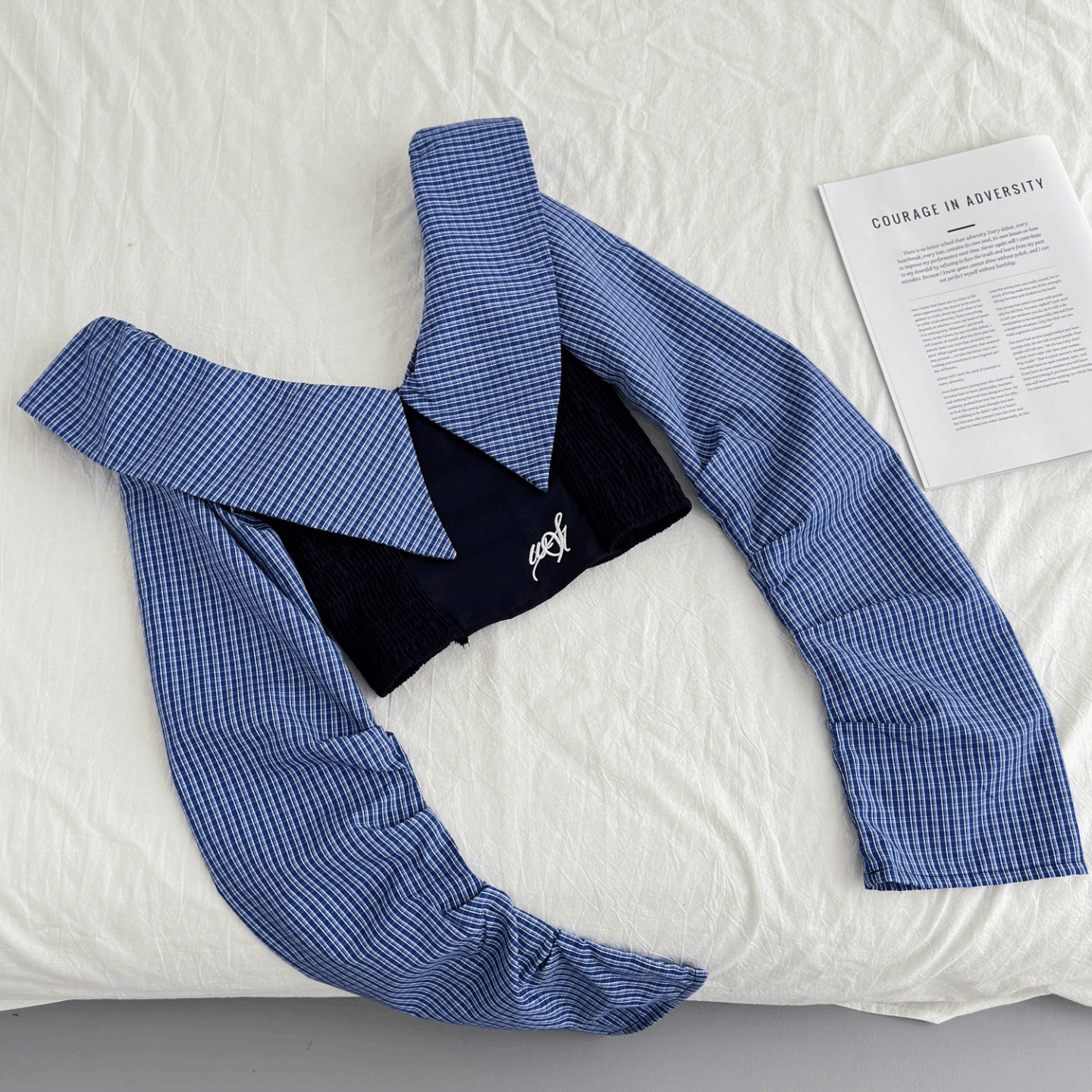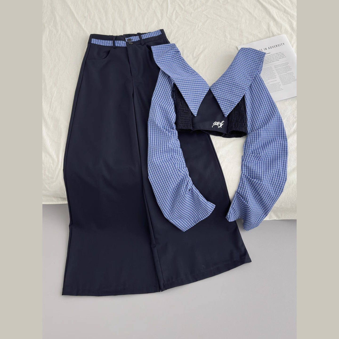 复古一字肩条纹拼接长袖衬衫上衣大码显瘦阔腿裤百搭休闲裤两件套