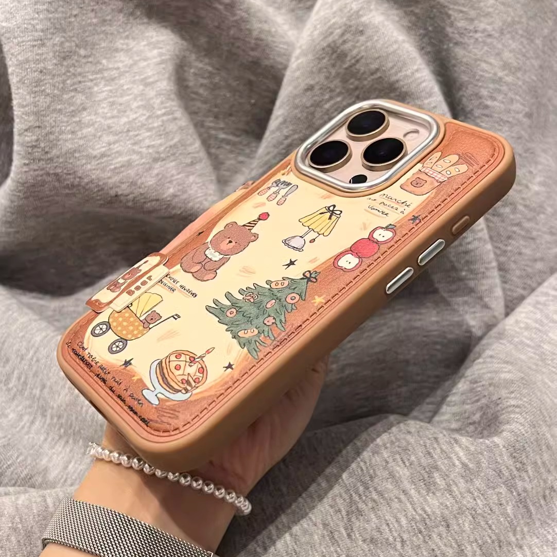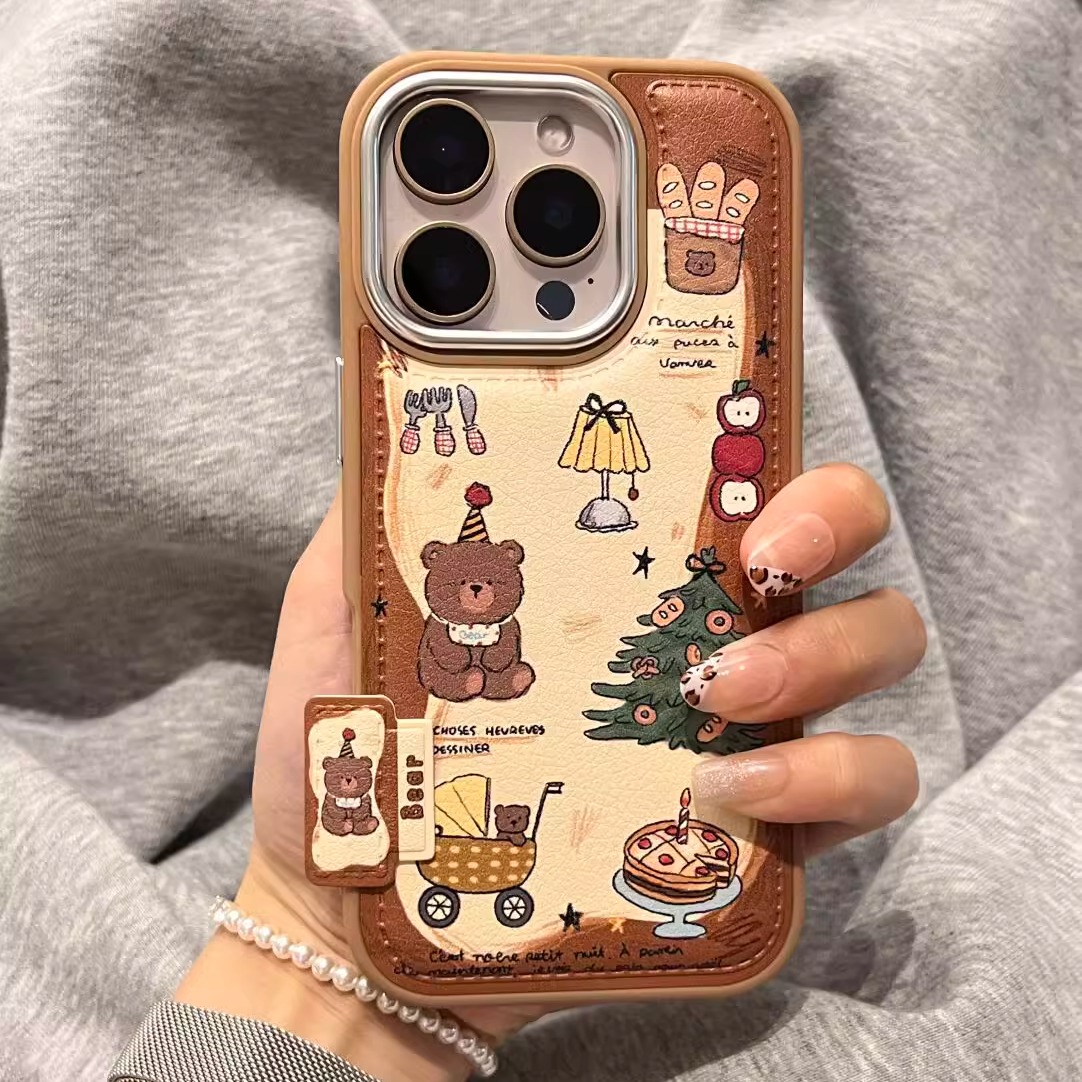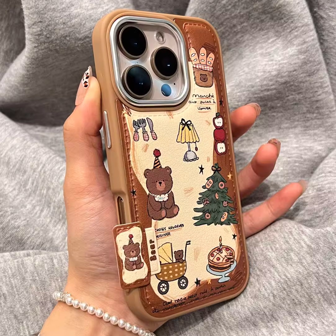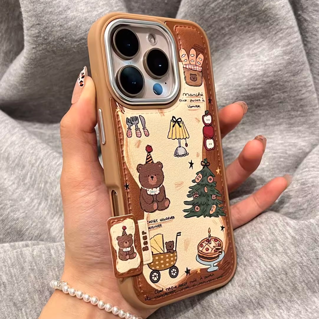 卡通棕色皮纹小熊iPhone16promax手机壳苹果17promax皮质15pro小众创意17pro高级感13不撞壳16全包14女保护套