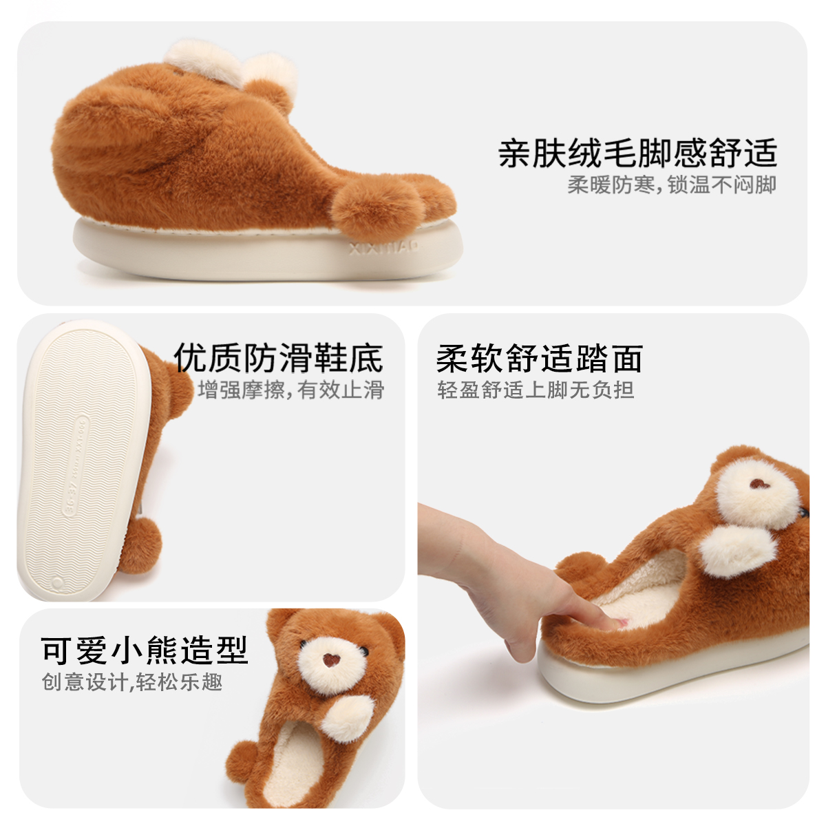 细细条 女冬学生可爱温暖抱抱小熊棉拖鞋居家防滑毛毛保暖月子鞋