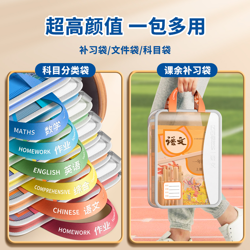 科目分类袋小学生学科袋手提拎书袋学生一年级拉链式试卷收纳袋分科整理文件袋学科课本学习资料作业开学必备