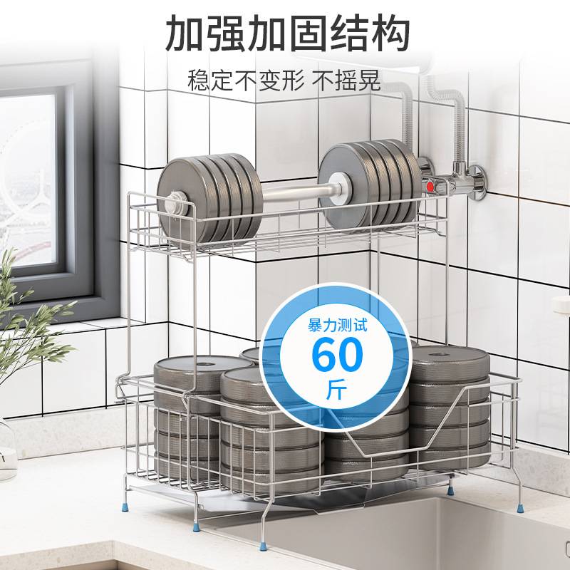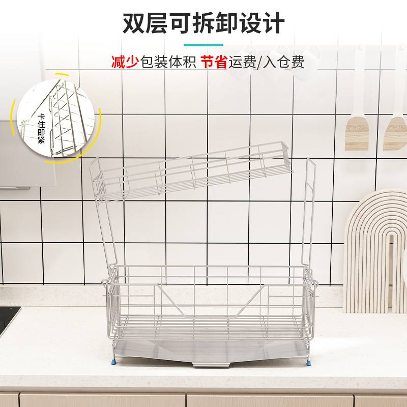 新款双层伸缩沥水篮收纳轻奢厨房置物架层304不锈钢台面碗碟杯架
