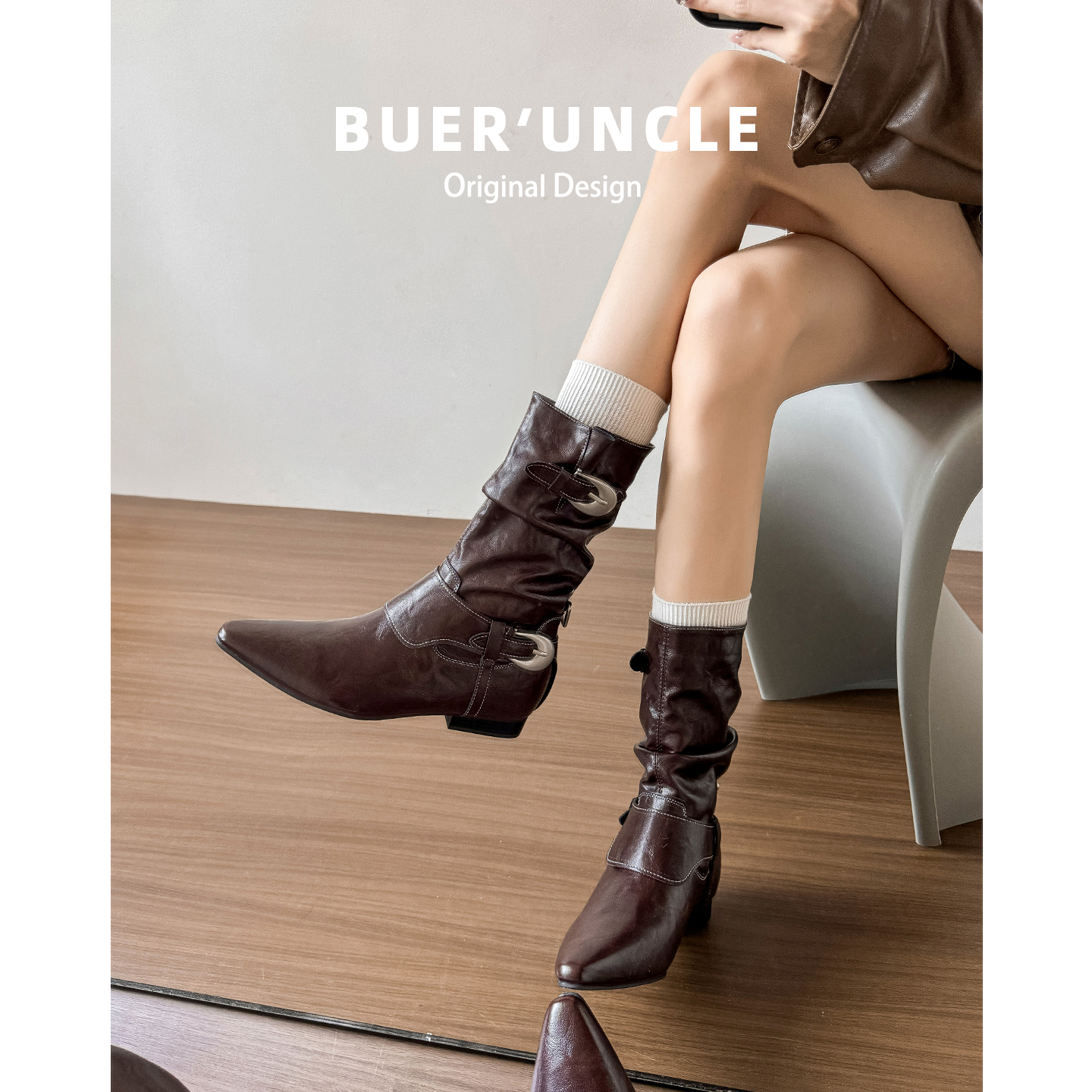 真皮~内增高短靴女2025年秋季新款美拉德复古粗跟堆堆西部牛仔靴