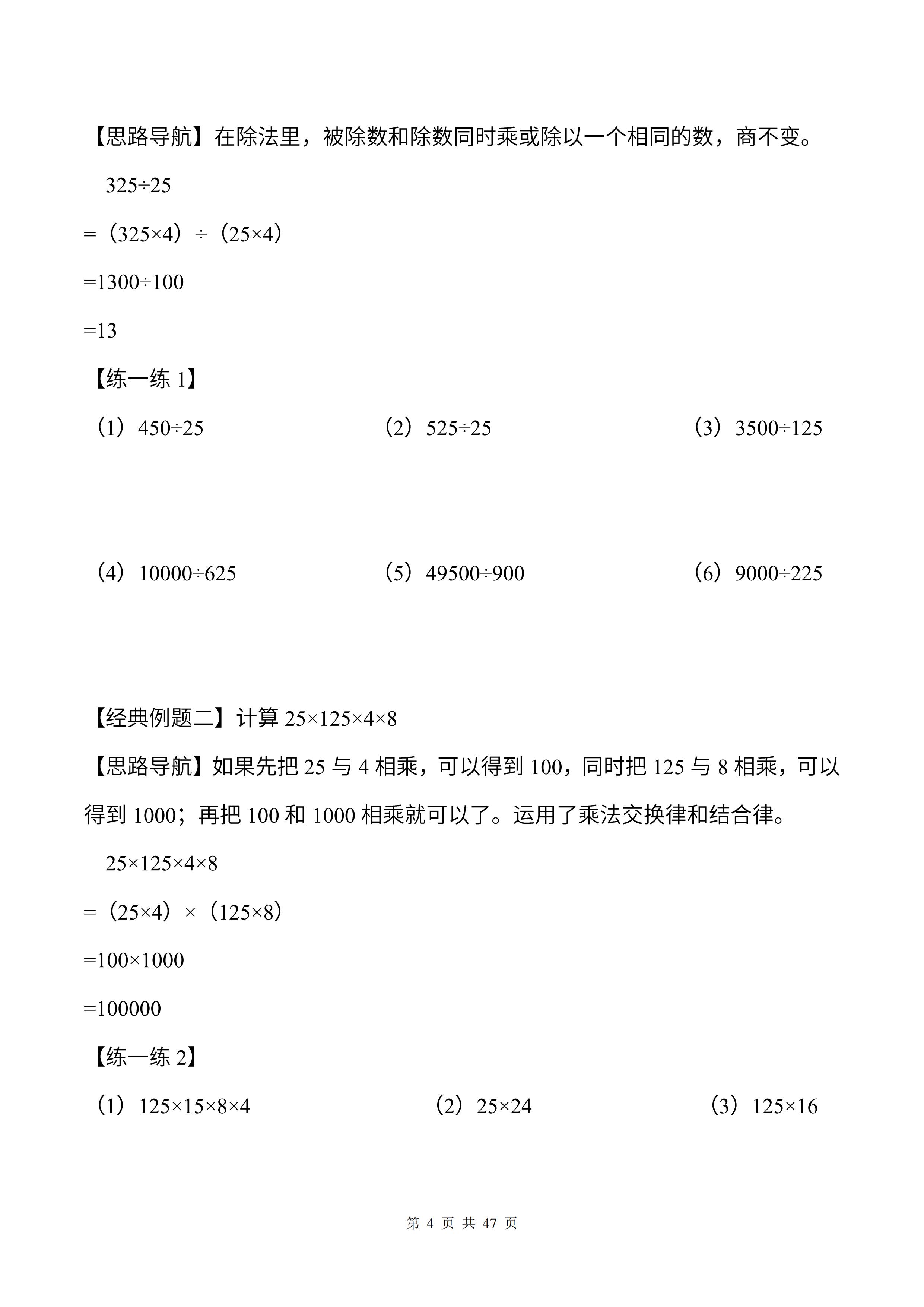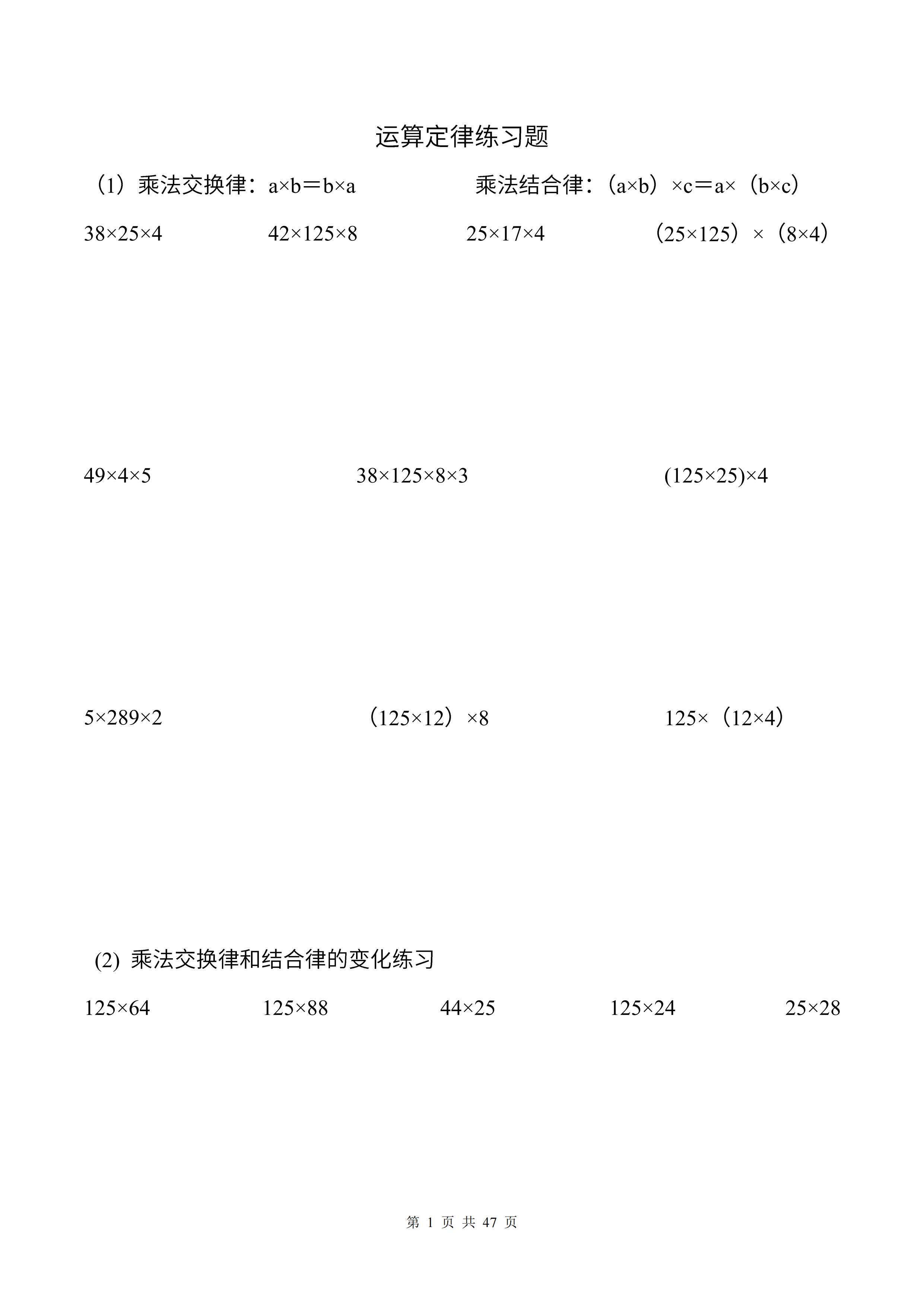 小学四年级数学简便运算四则运算计算乘法分配律结合律交换率练习