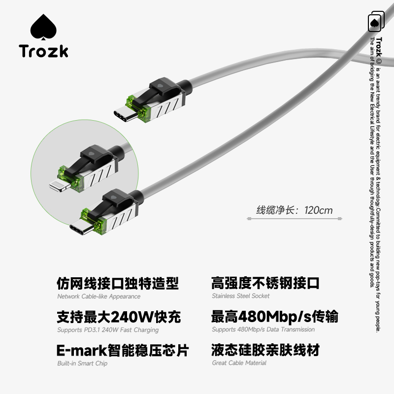 TROZK特洛克快网240W/27W快充数据线type-c超级快充安卓闪充适用于小米华为手机typc加长快充线