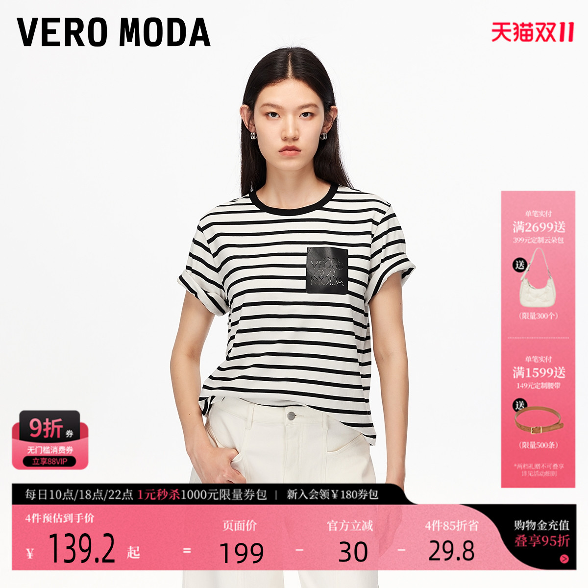 Vero ModaT恤2025夏秋新款含棉再生纤维素纤维条纹圆领正肩上衣
