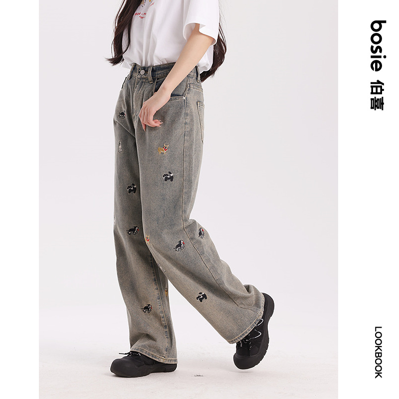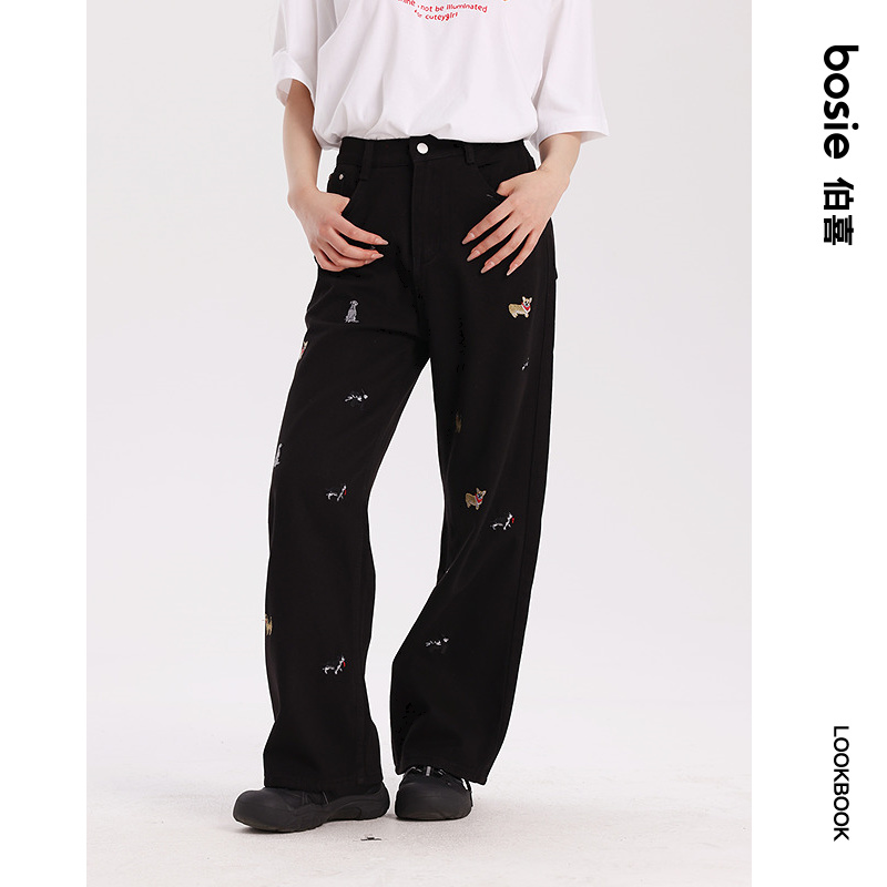 bosie2025秋季新款牛仔裤男情侣款卡通小狗刺绣时尚休闲直筒长裤