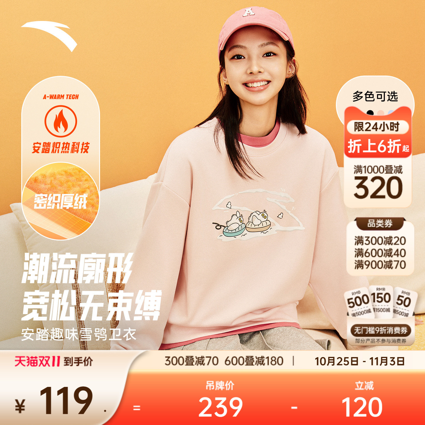 安踏雪鸮卫衣丨减龄套头衫女冬季新款加绒休闲宽松多巴胺运动上衣