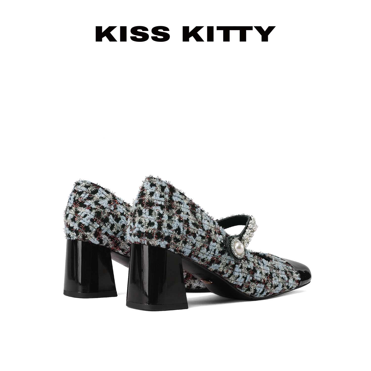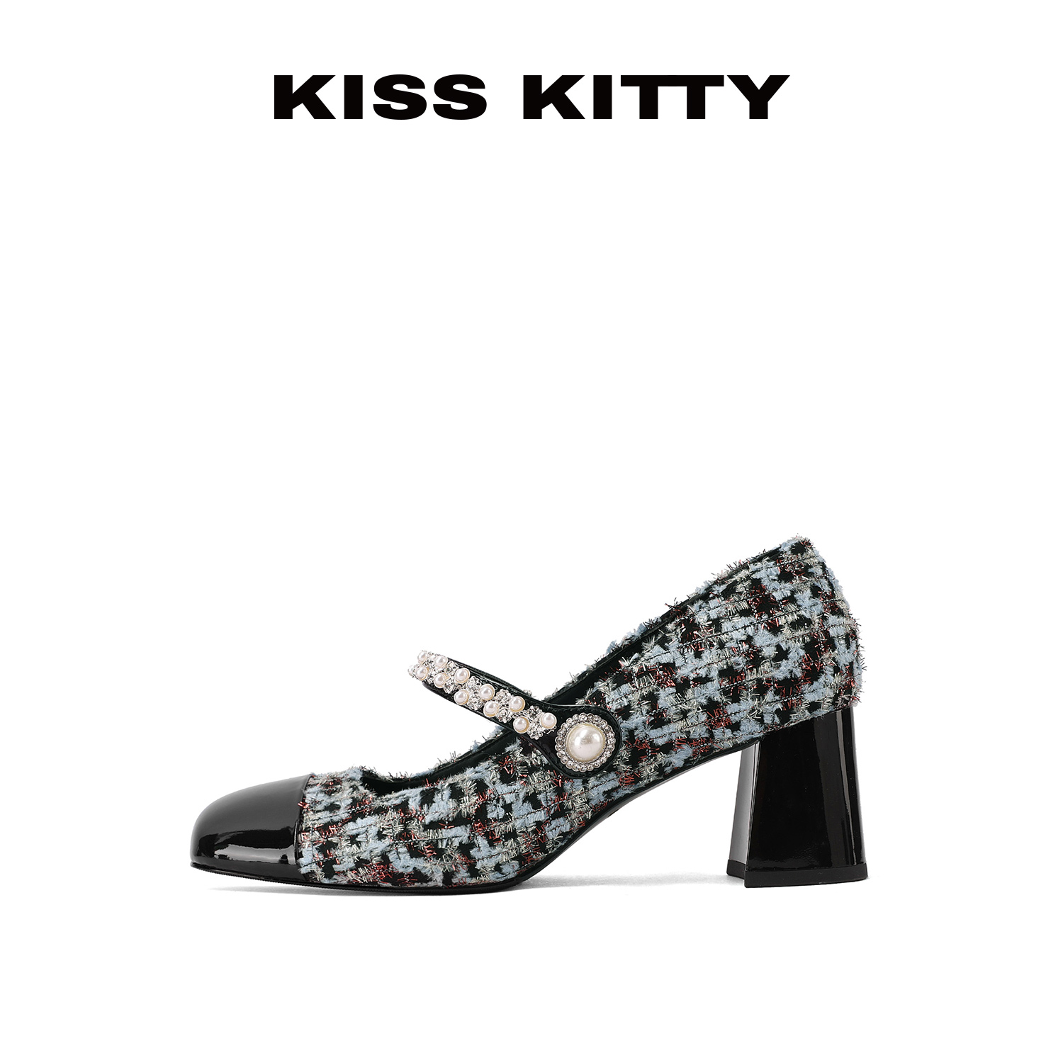 KISSKITTY玛丽珍单鞋女2025新款粗跟方头拼接法式巨好看的高跟鞋