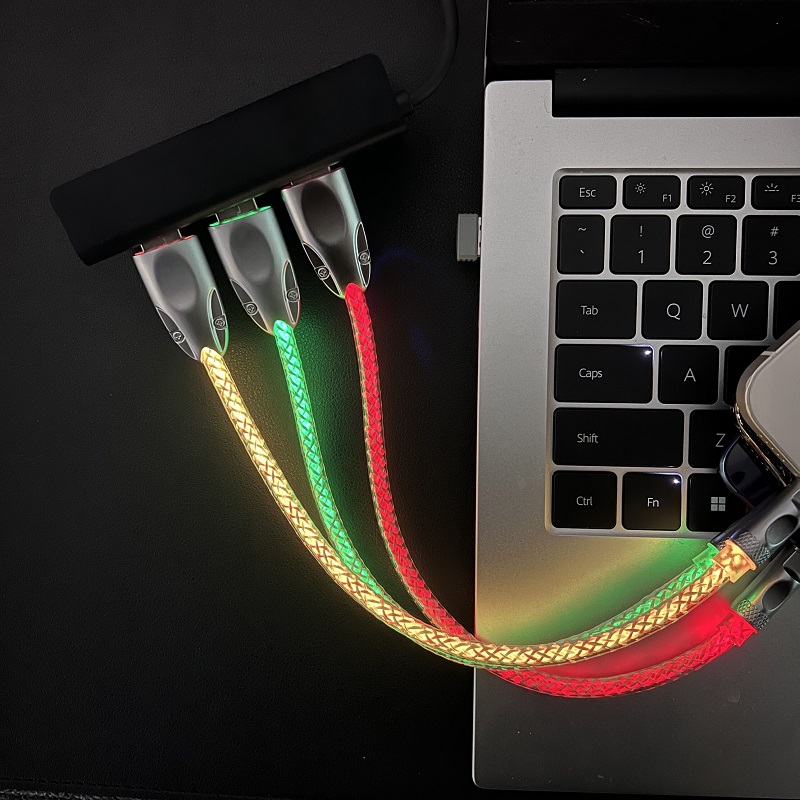 新款100w一拖三快充数据线车载三合一带灯超级闪充适用苹果iphone华为荣耀Type-C安卓vivo通用充电器多头