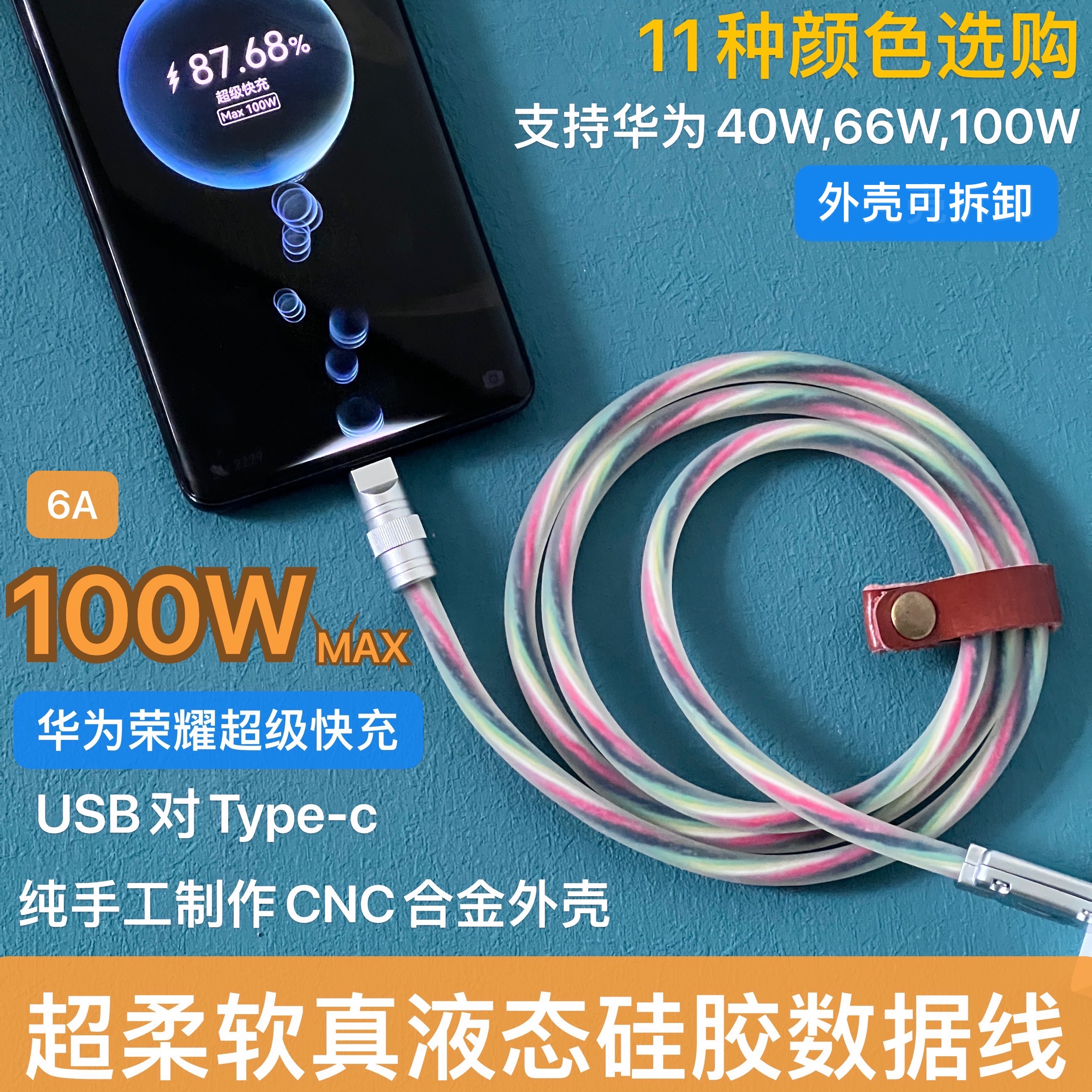 客制化DIY适用华为荣耀66W数据线6A超级快充USB对TYPEC充电硅胶线