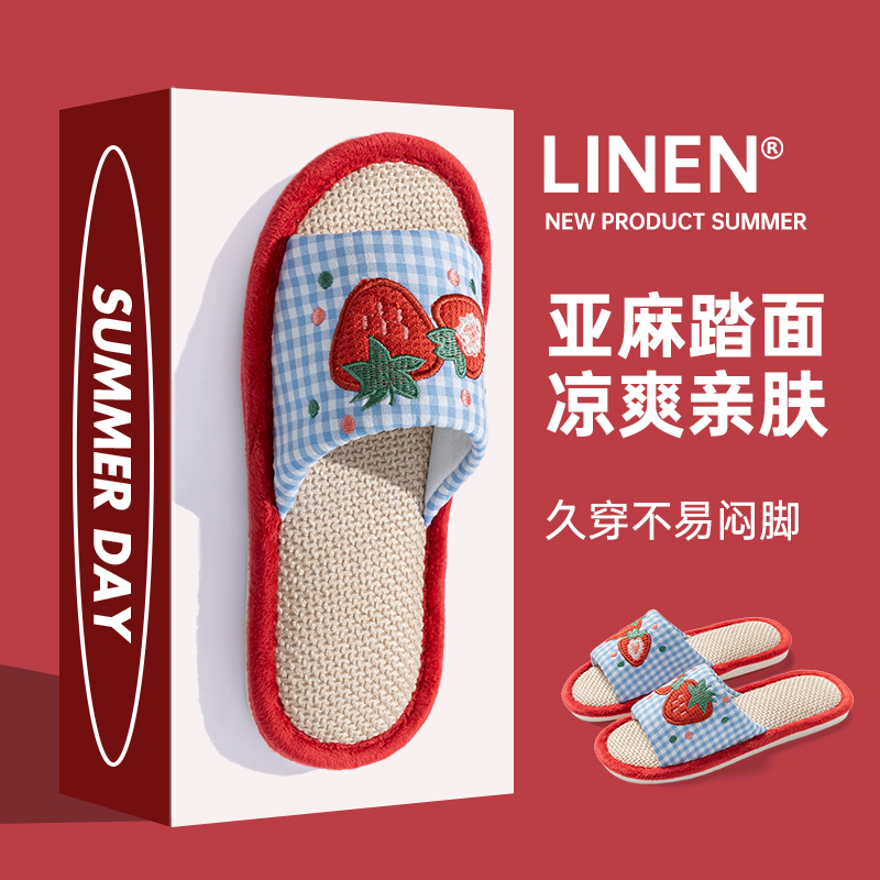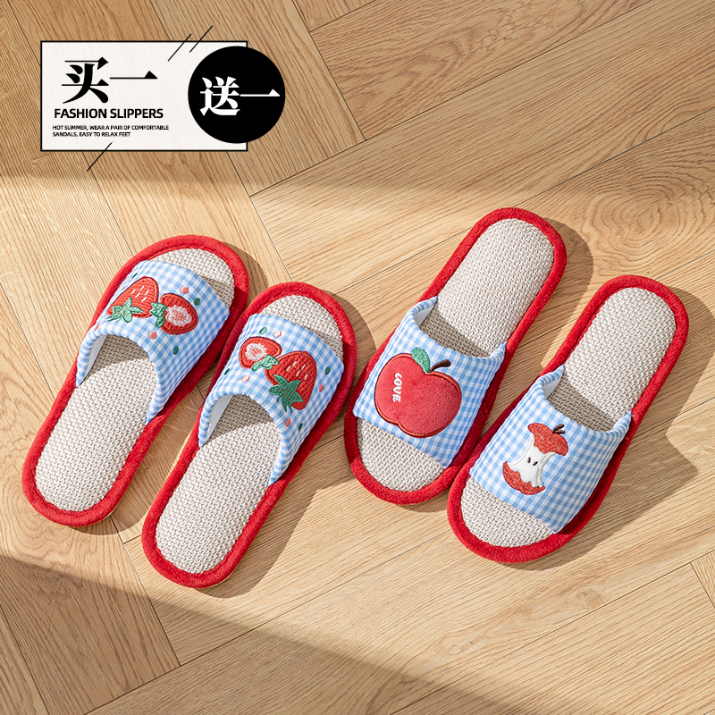 买一送一苹果草莓亚麻拖鞋春秋四季女居家防滑透气情侣家用厚底男