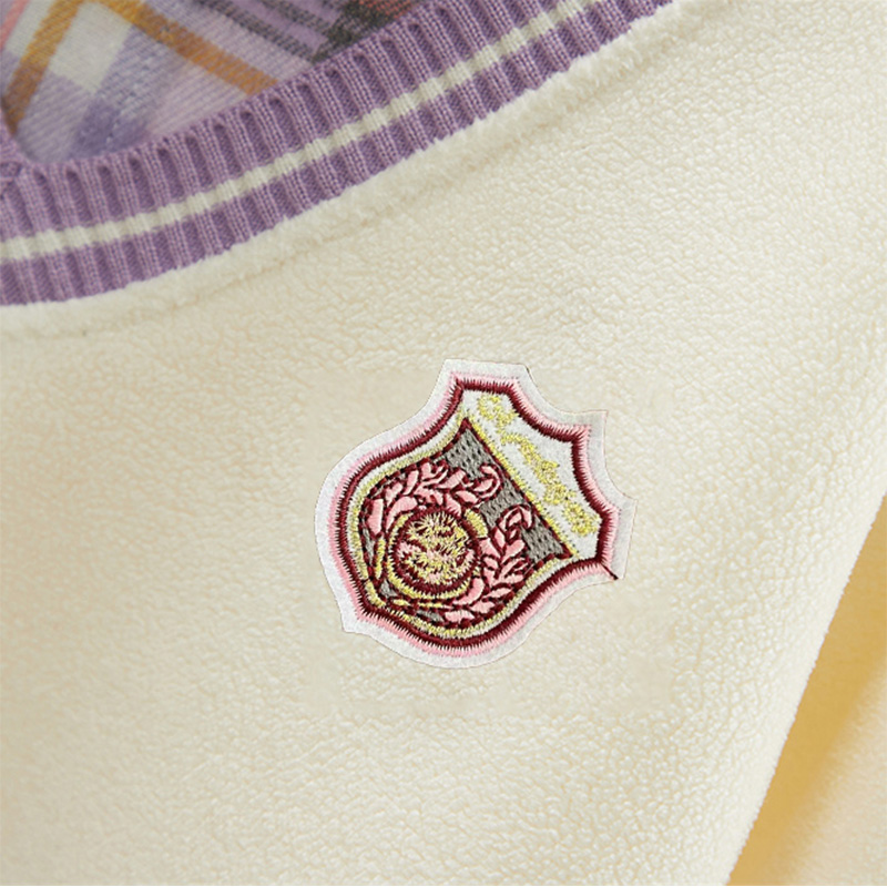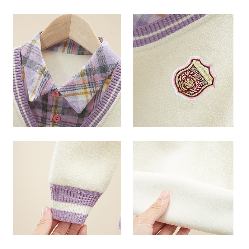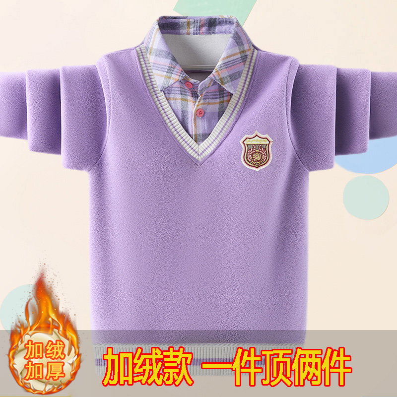 秋冬新款女童假两件毛衣学院风加绒衬衫领拼接精致胸标中大童上衣
