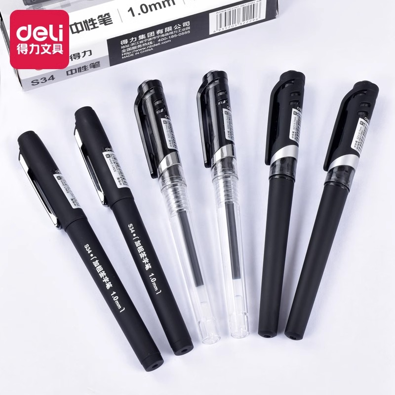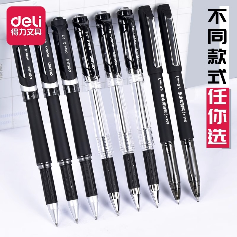 得力1.0mm加粗中性笔黑色粗笔画签名笔签字水笔0.7mm商务碳素硬笔书法专用练字粗头笔芯粗笔杆学生用圆珠笔