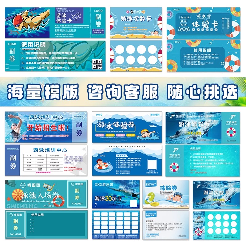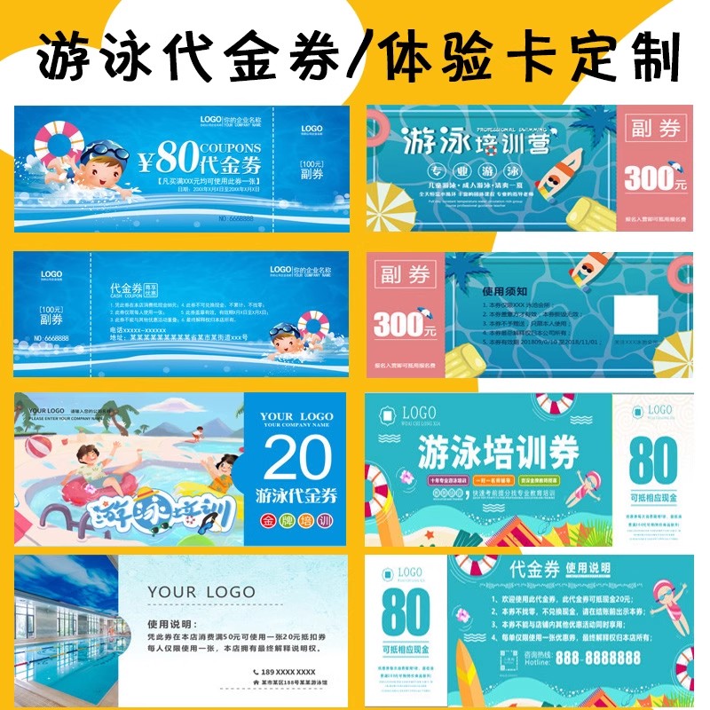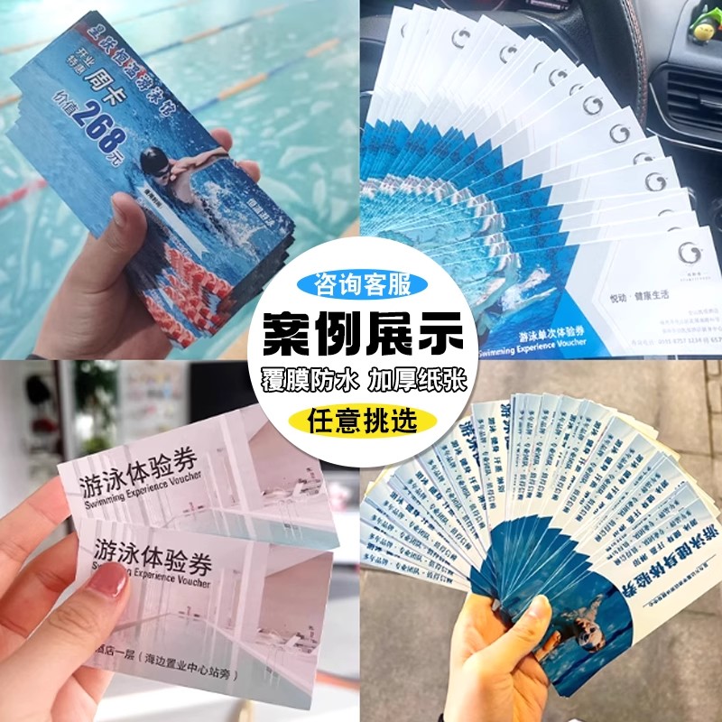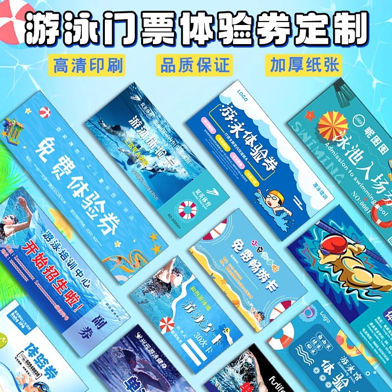 游泳票体验券定制泳池馆广告宣传优惠券设计logo培训班代金券正副券可撕印刷计数月卡单次卡水上乐园门票制作
