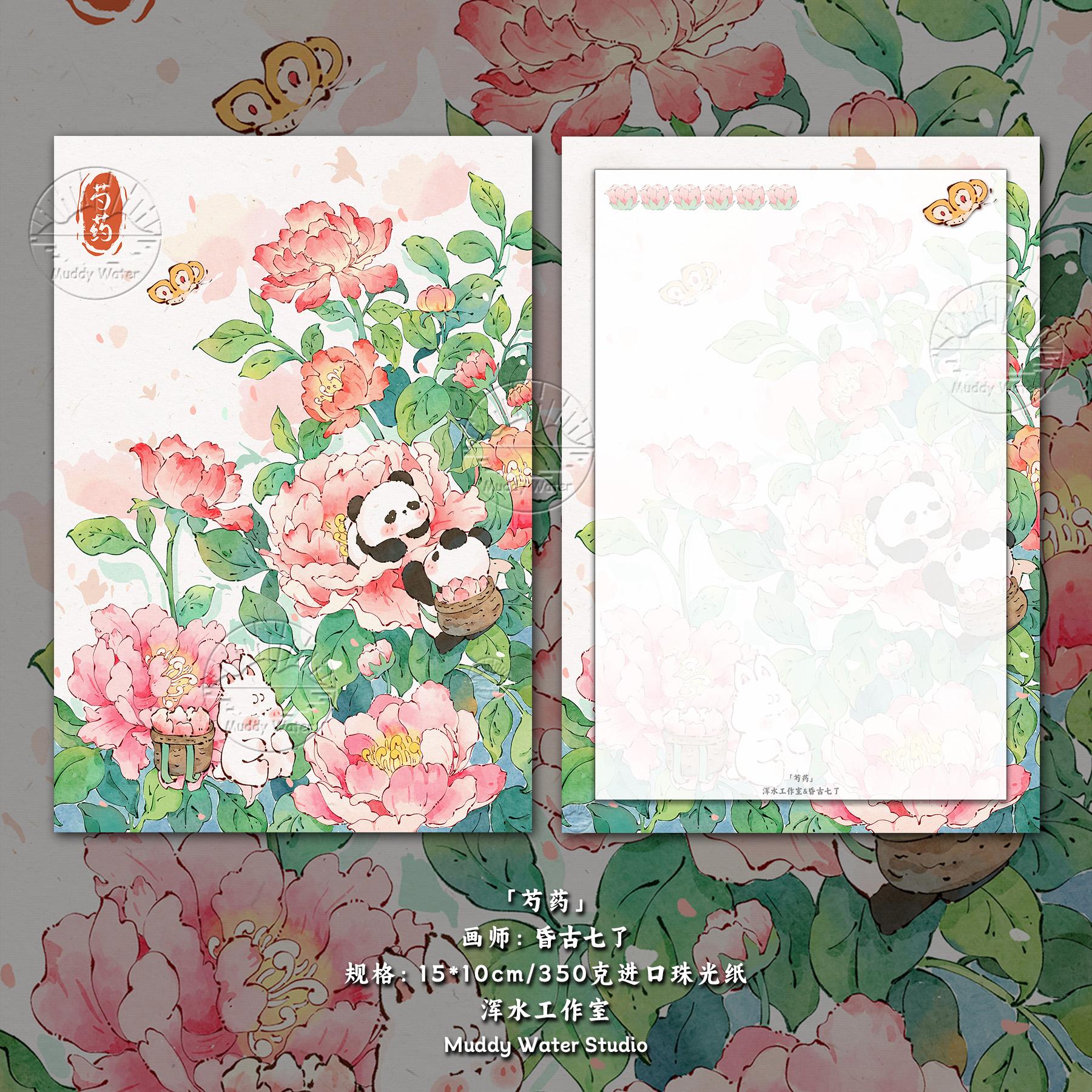 「芍药熊猫」原创插画明信片小众手绘卡通动漫可爱熊猫创意贺卡