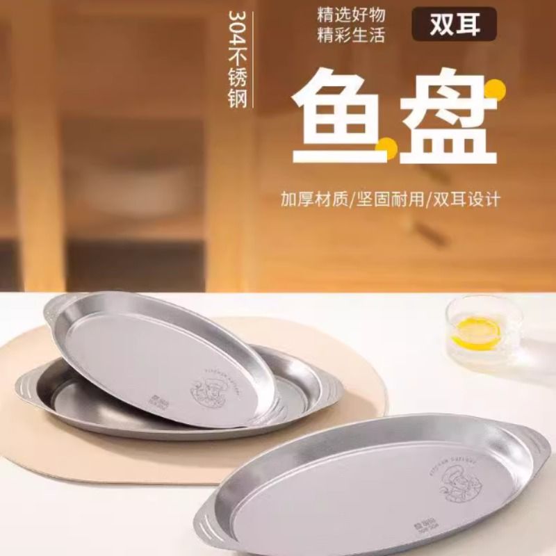 食品级304不锈钢装鱼盘双耳家用的清蒸鱼盘子专用蒸鲈鱼碟椭圆