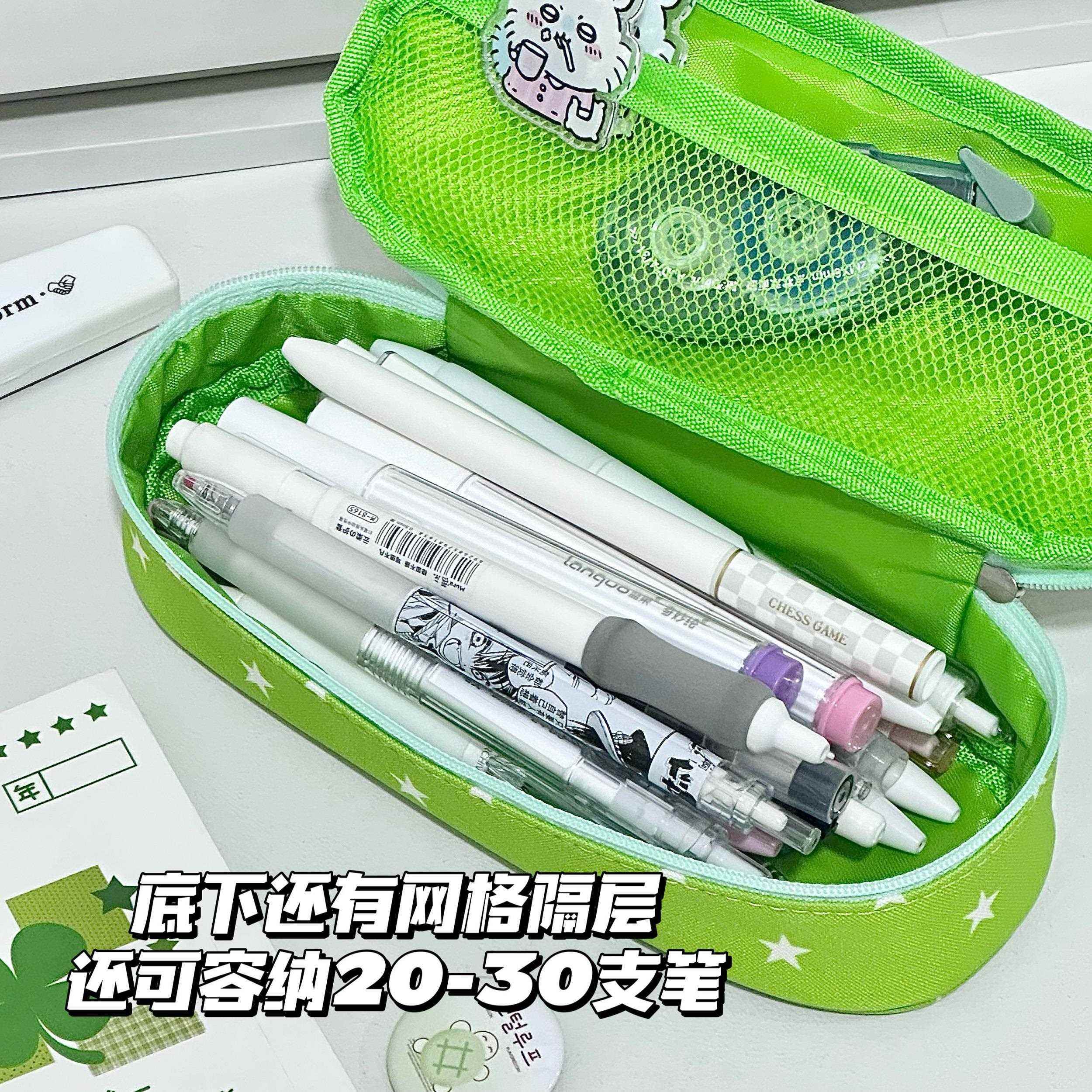 古早绿色四叶草小猫可立式笔袋双层透明铅笔盒高颜值大容量文具袋