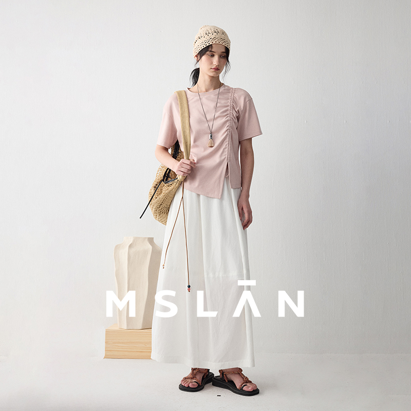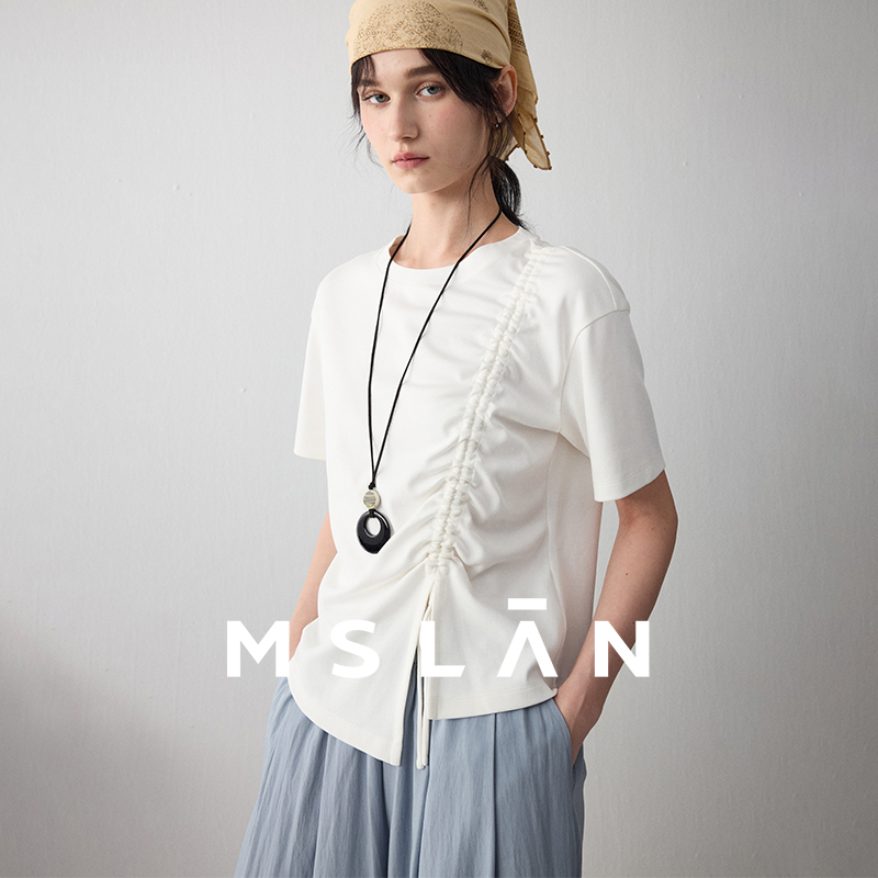 樱花T/MSLAN温柔浅春系 抽褶开叉简约收腰扭结甜美短袖T恤夏新款