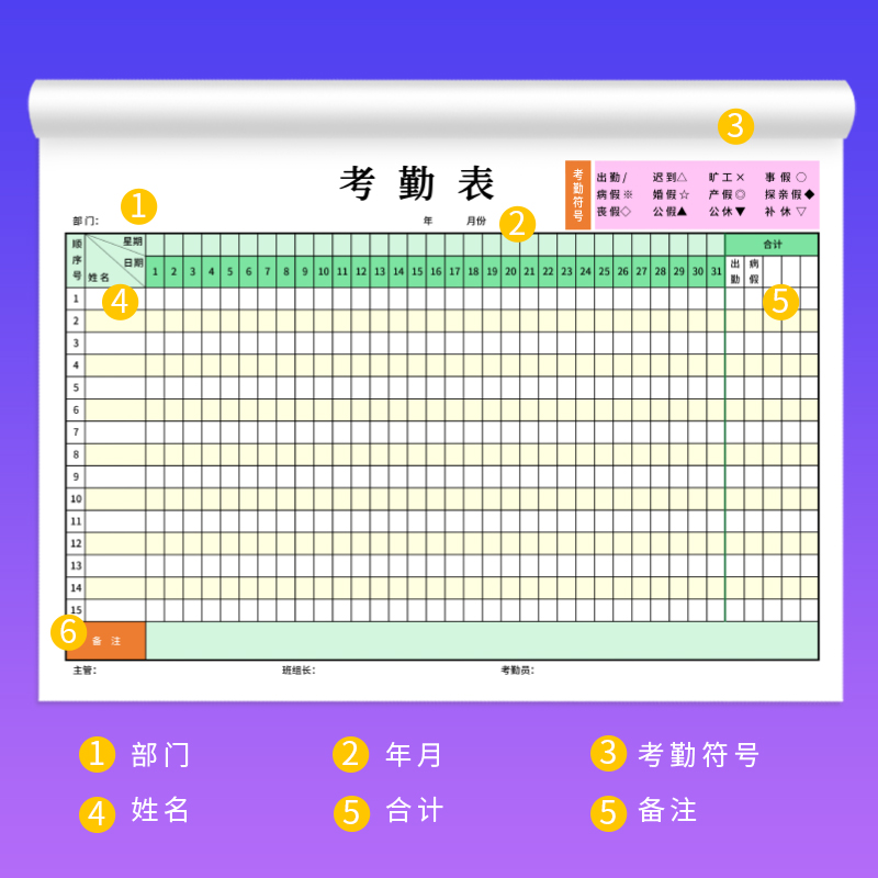 考勤表工地员工打卡本子模板彩印上班工资考核表格单上下午加班记工登记本31天学生出勤纸工天签到记录本