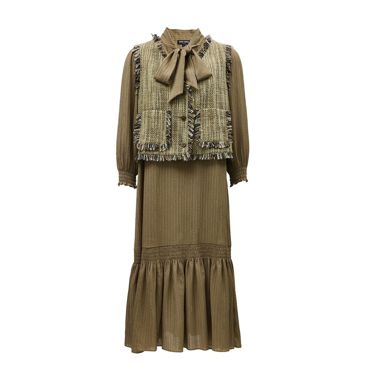 v区绫致Vero Moda连衣裙女25春夏编织毛边马甲系带V领真两件套装