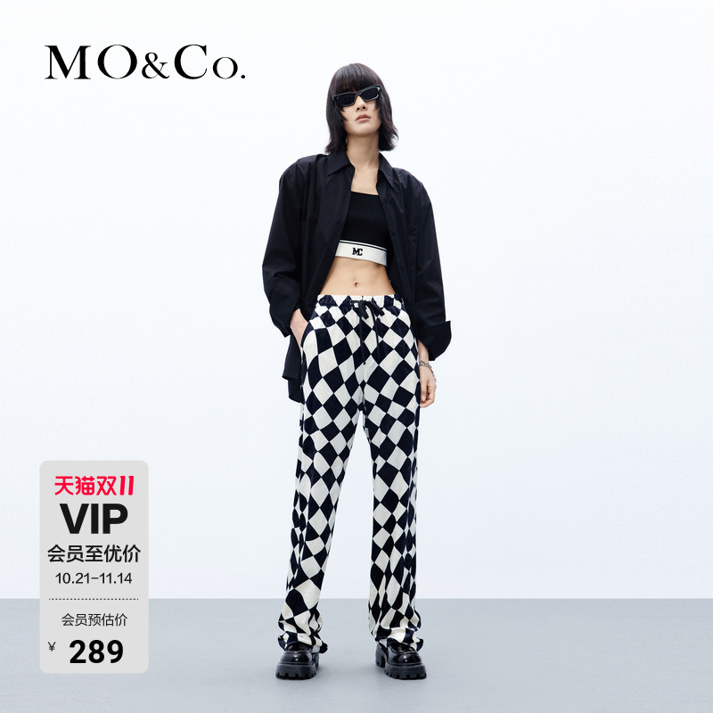 MOCO设计感棋盘格丝绒感抽绳高腰及地休闲裤裤子女软糯风