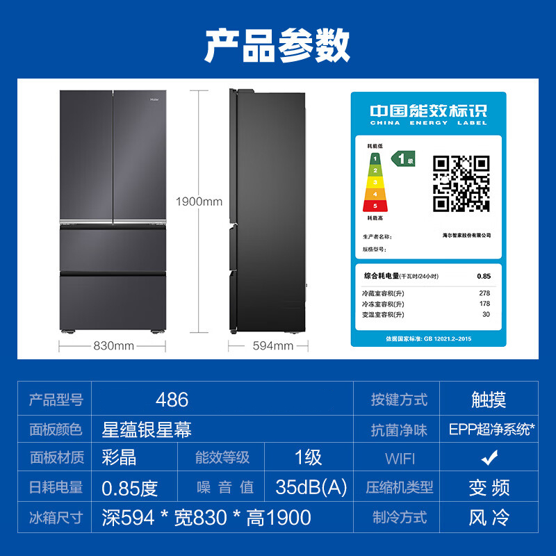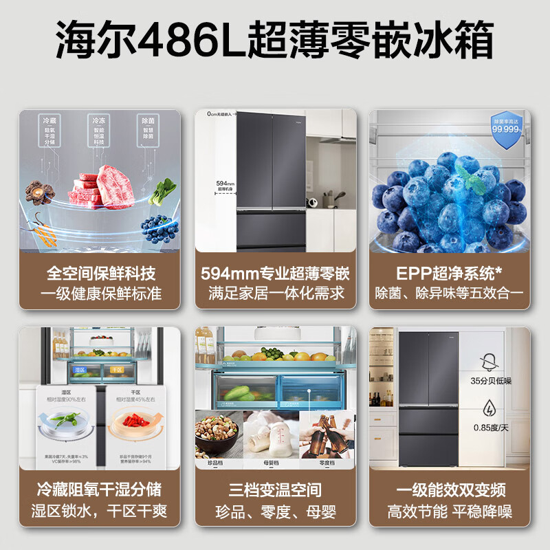 政府换新补贴海尔山茶花485L零嵌入式法式一级大容量风冷无霜冰箱