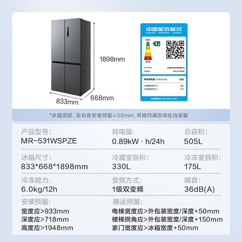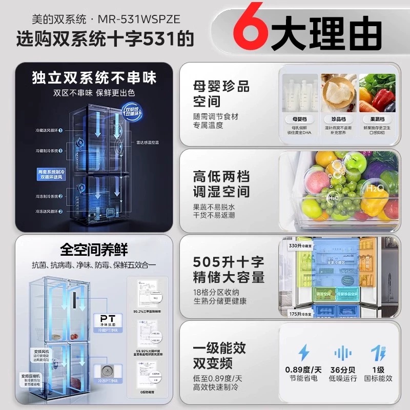 美的十字双开531双系统循环冰箱对开四门一级风冷无霜家用嵌入式