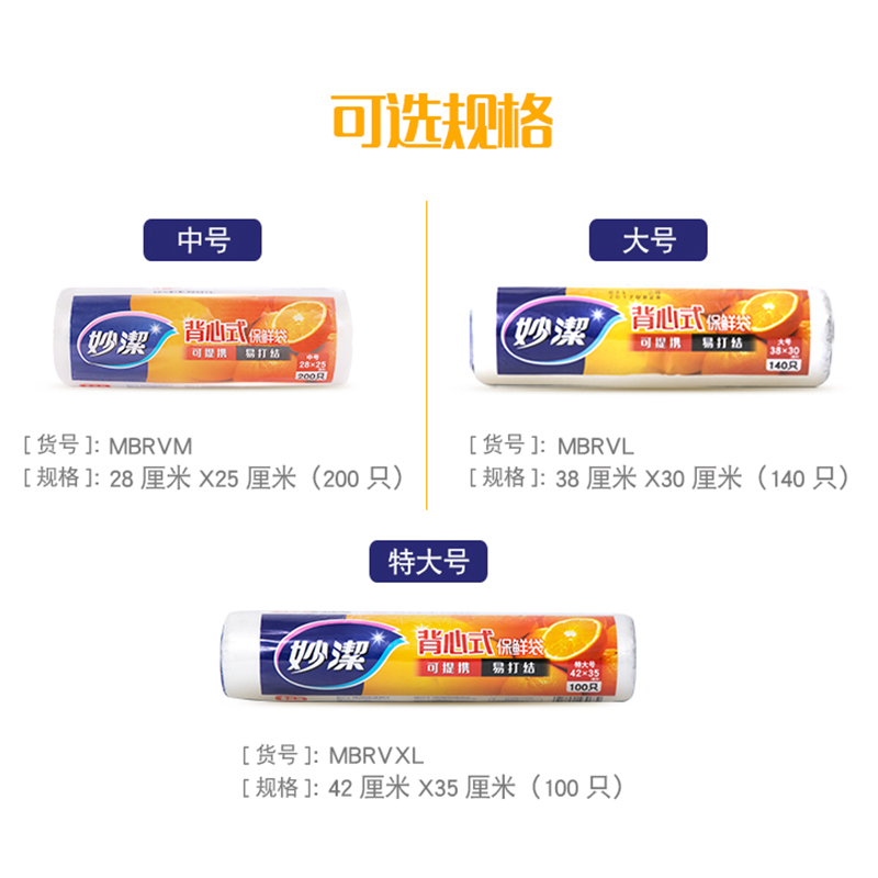 妙洁保鲜袋食品级家用背心式特大号手提式加厚冰箱食品专用袋卷装