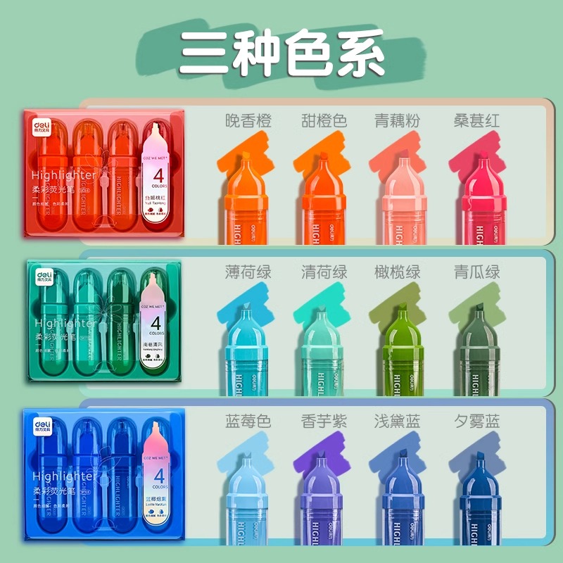 得力抗晕染荧光笔初中生专用划重点做笔记高颜值大容量荧光标记笔小学生专用彩色记号笔彩色荧光笔淡色系