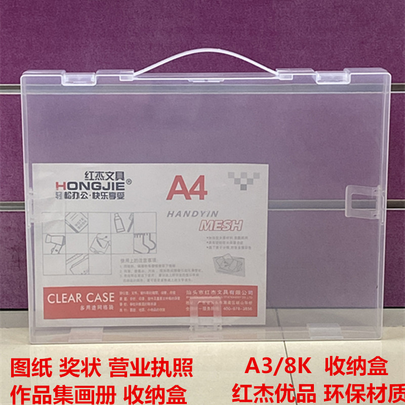 A3手提透明文件盒资料盒A4盒8k绘画图纸奖状营业执照14英寸收纳盒