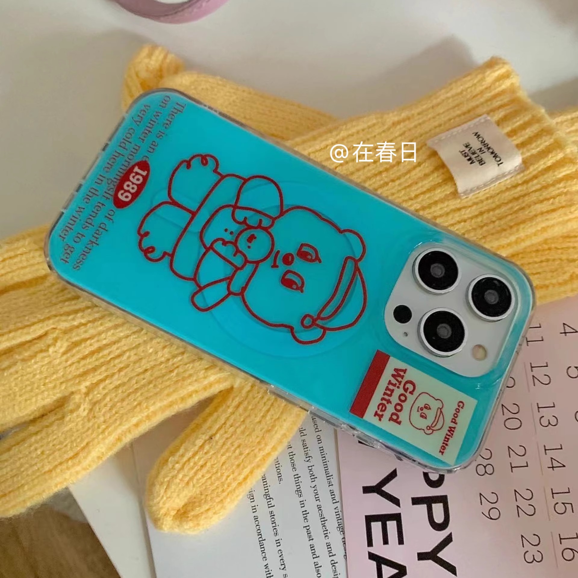 在春日明星迪丽热巴同款蓝色小熊双层磁吸插卡手机壳适用15promax/14新款iPhone16pro手机壳16promax/13