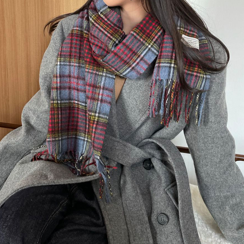 100%羊羔毛韩版格子长款围巾2021冬季新款女韩版百搭羊毛围脖保暖