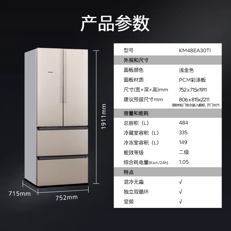 西门子484L多门家用电冰箱官方混冷无霜变频金色大容量48EA30