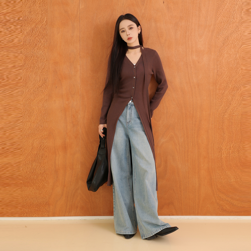 AIRIQI秋季新款法式慵懒修身飘带V领开叉中长款针织开衫AH43KS165
