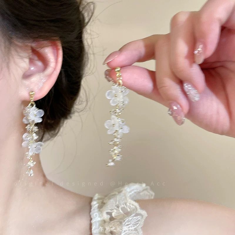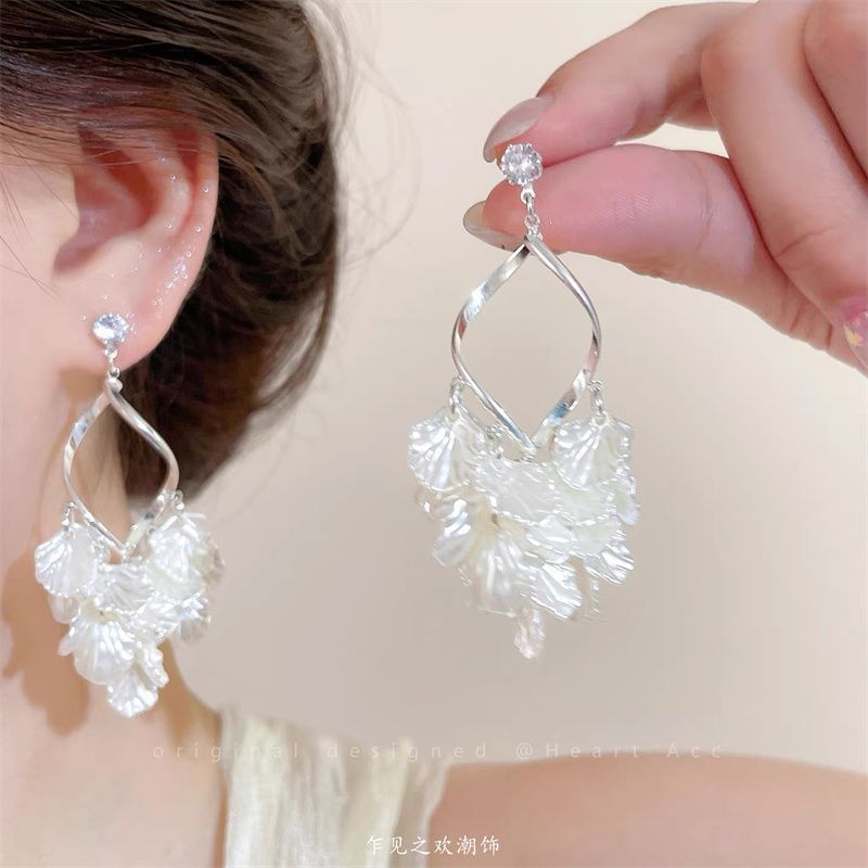法式贝壳花瓣流苏耳环女款夏天轻奢小众耳钉高级感无耳洞耳夹耳饰