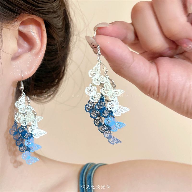玫瑰冰茶~蓝色流苏花朵耳钉女高级感度假风小众耳环绝美耳饰耳夹