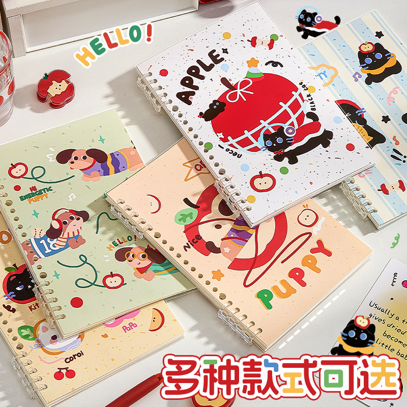 咔巴熊苹果小猫横线活页笔记本本子初高中加厚高颜值动物活页本少女日常可爱日记本可拆卸不硌手小学生记事本