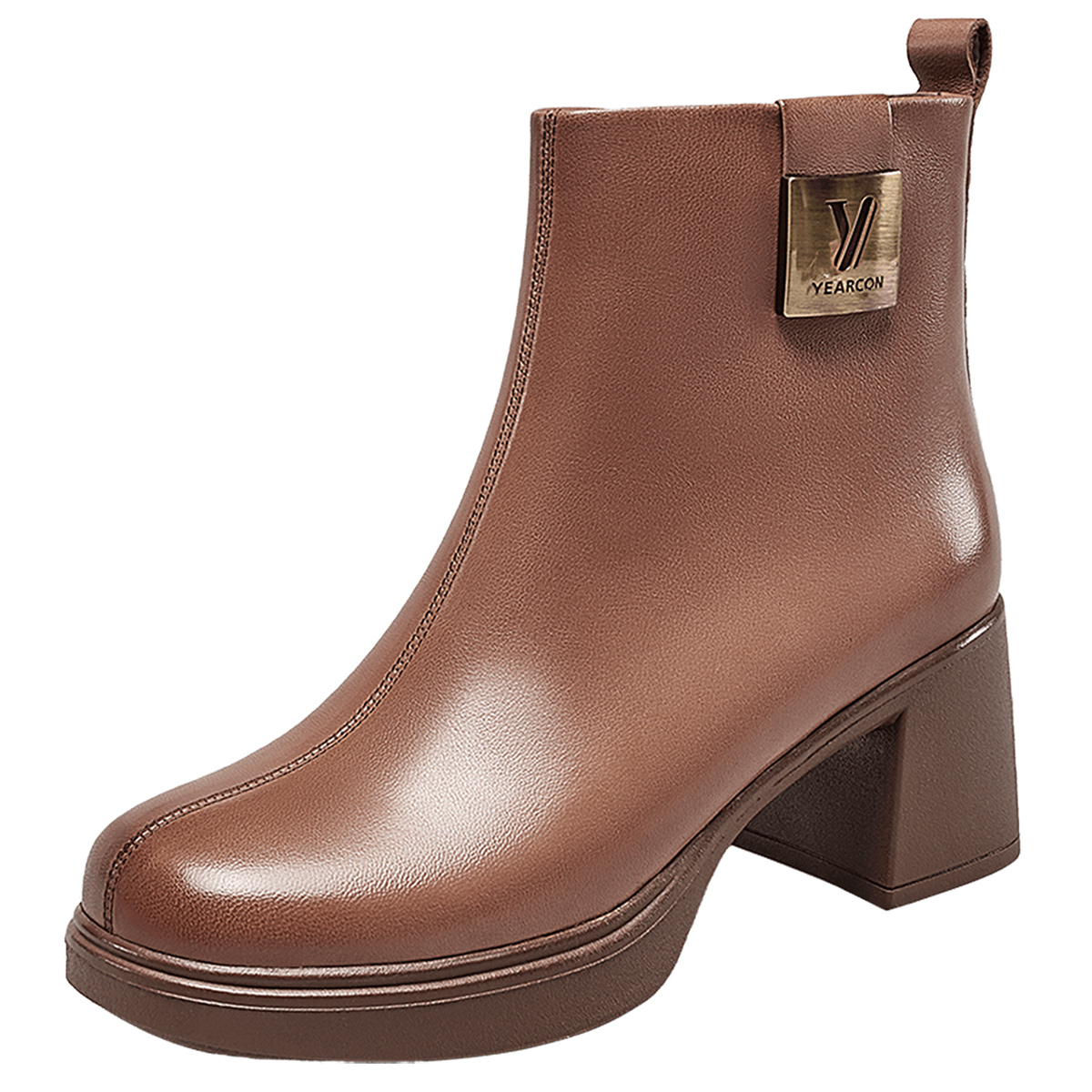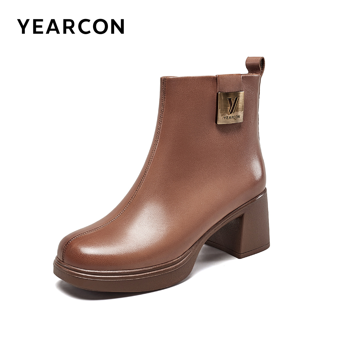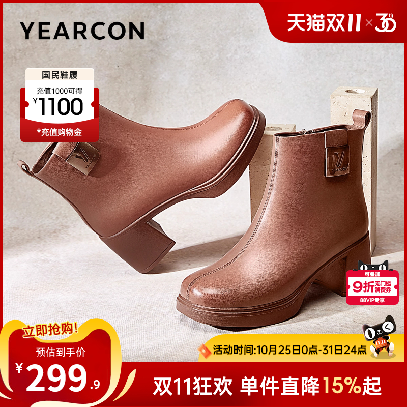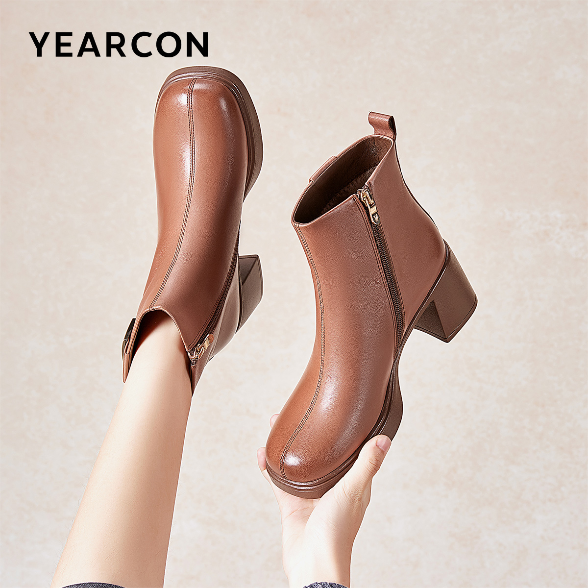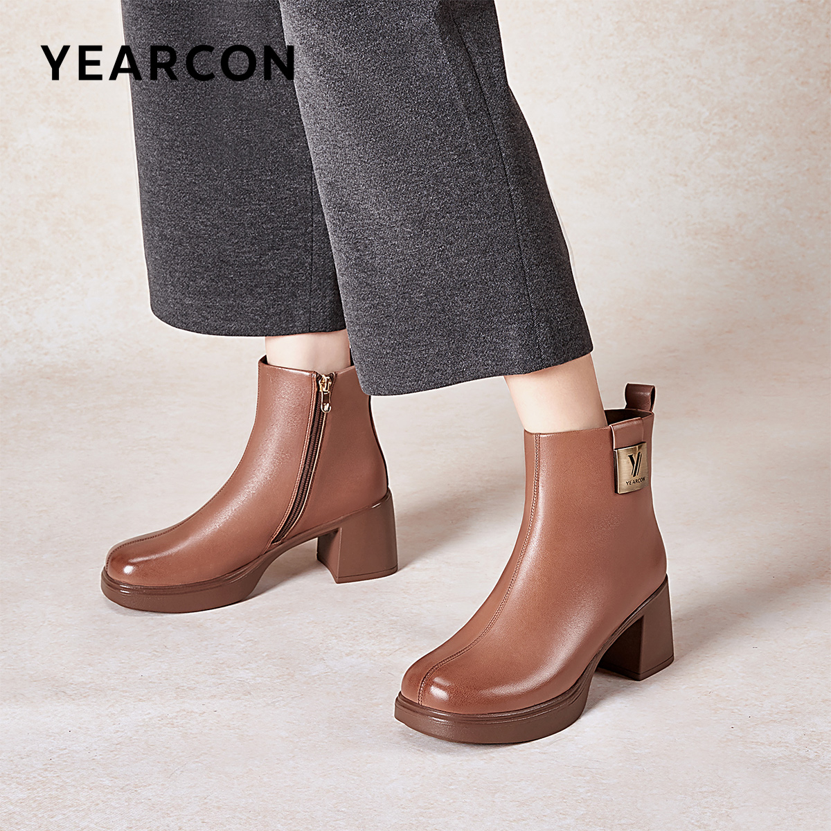 意尔康女鞋冬季真皮法式加绒短靴粗跟气质显瘦羊皮及踝靴女士皮鞋