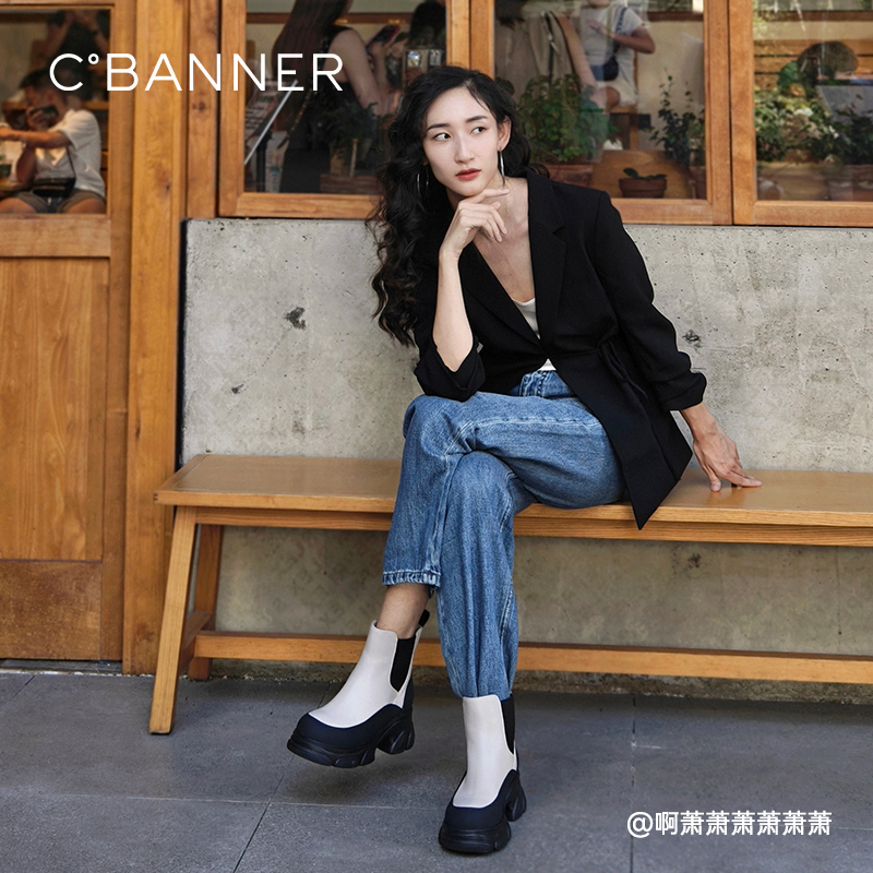 千百度厚底真皮拼接切尔西靴女2024冬季新款增高烟筒靴洋气小短靴
