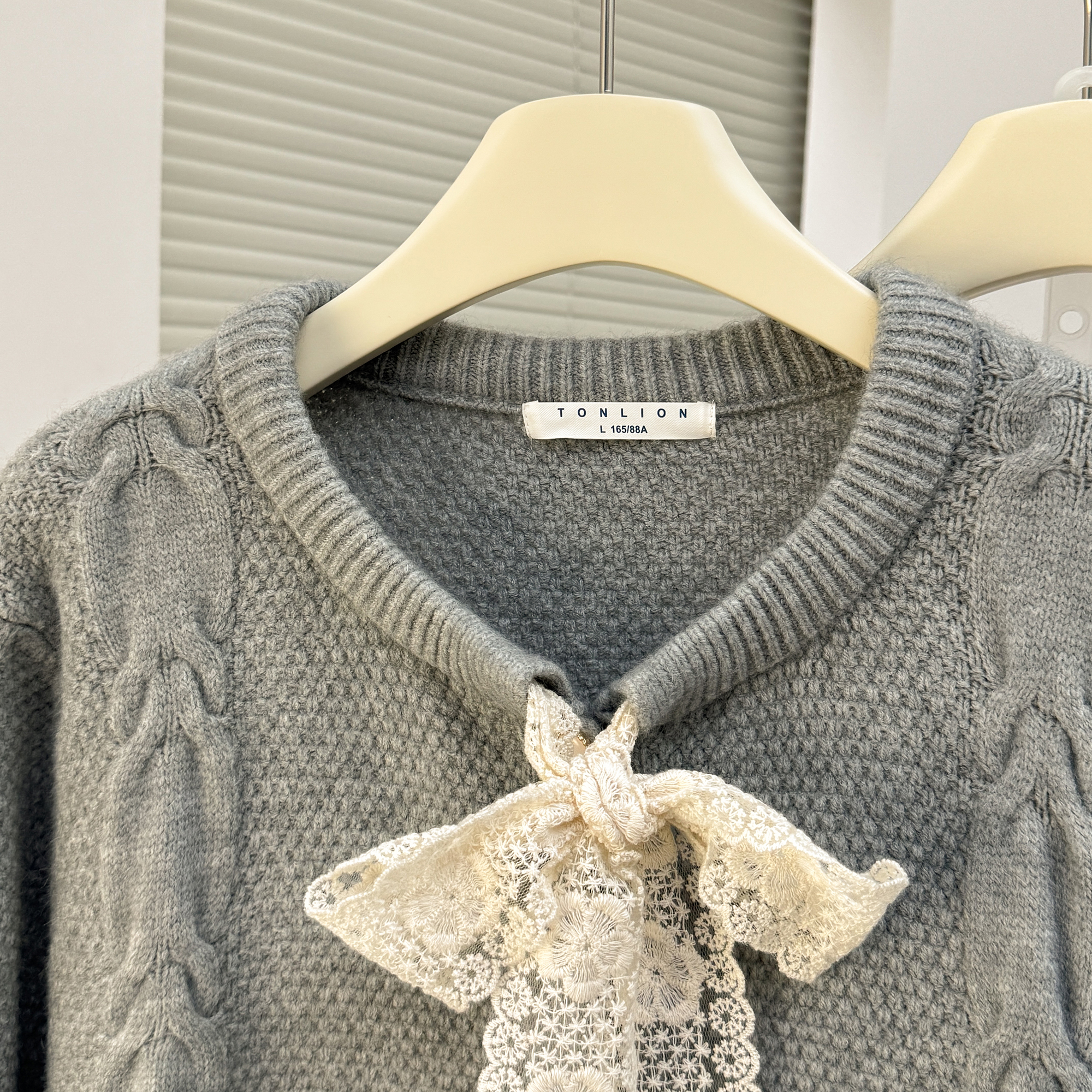唐狮秋冬季女毛衣温柔风蕾丝蝴蝶结设计开衫可爱日常百搭tu