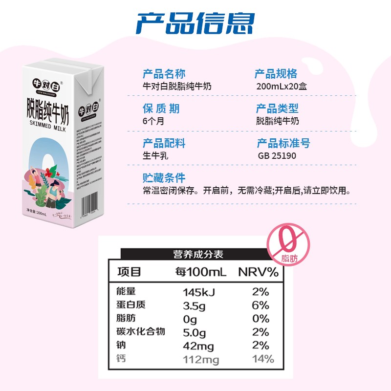 9月产3.5蛋白 牛对白0脂肪脱脂纯牛奶200mL*20盒/箱生牛乳整箱发