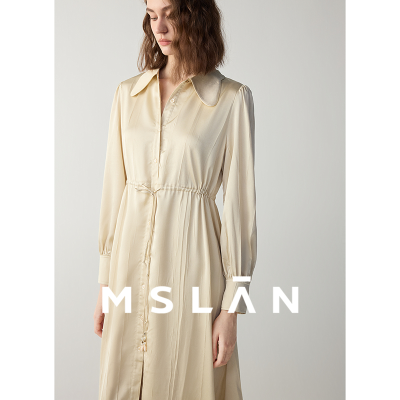 MSLAN温柔月光 25秋轻法风缎面连衣裙 轻奢不规则收腰翻领衬衫裙