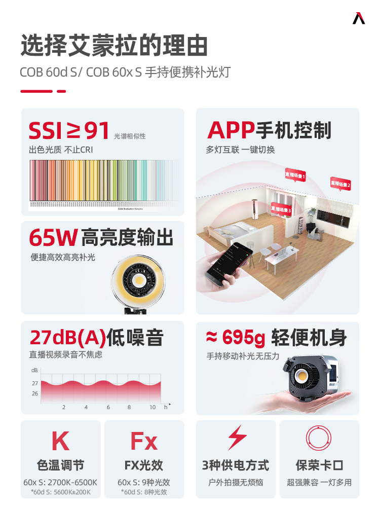 Aputure/爱图仕 艾蒙拉 Amaran 60d 60x S LED双色温补光灯 cob60w 宝荣口摄影灯手持室内户外拍摄灯光直播灯
