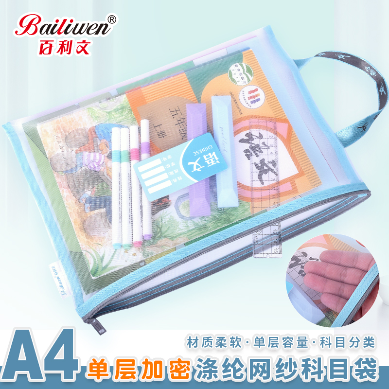 百利文学科科目分类文件袋加厚A4双层科目袋网纱袋中小学生用透明试卷作业收纳袋单层防水综合书籍手提大容量
