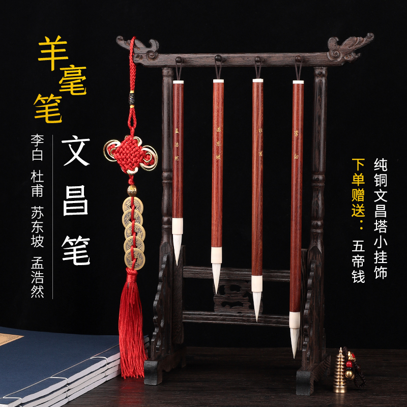 文昌笔4支+笔架红檀木文昌羊毫毛笔四支大小不同长短不一毛笔 刻